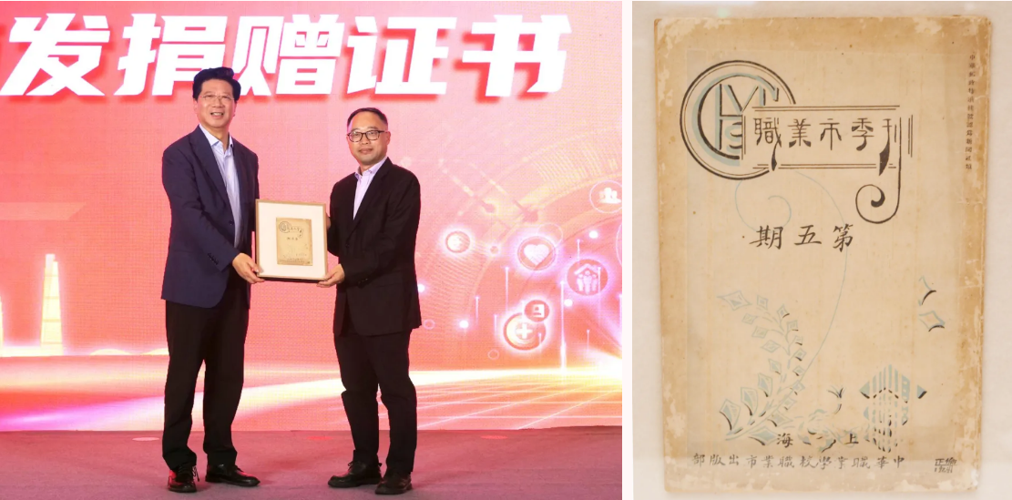 会上举行了简朴而庄重的捐赠仪式,由胡卫向爱心社员费永明先生颁发了捐赠证书。本次获赠的为1924年创刊的《职业市季刊(第五期)》,该刊记录了近代中国职业教育早期发展状况和对学生自治的实践探索,是研究中华职业学校校史、黄炎培职教思想及民国时期职业教育改革的重要文献。这份珍贵史料的回归,不仅丰富了职教社的典藏,更将激励广大职教人传承先辈“一份精神全为国,一寸光阴全为民”的崇高精神,在新时代职业教育的征途上砥砺前行、再续华章!