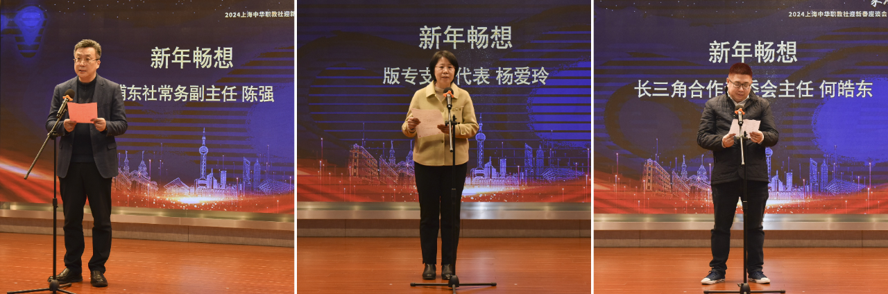 在新年畅想环节,浦东社常务副主任陈强,市社社务委员、版专支社代表杨爱玲,长三角合作专委会主任何皓东分别代表区社、基层组织、专委会发言,充分表达了职教社各级组织迎接挑战,做好新年各项工作的信心和决心。