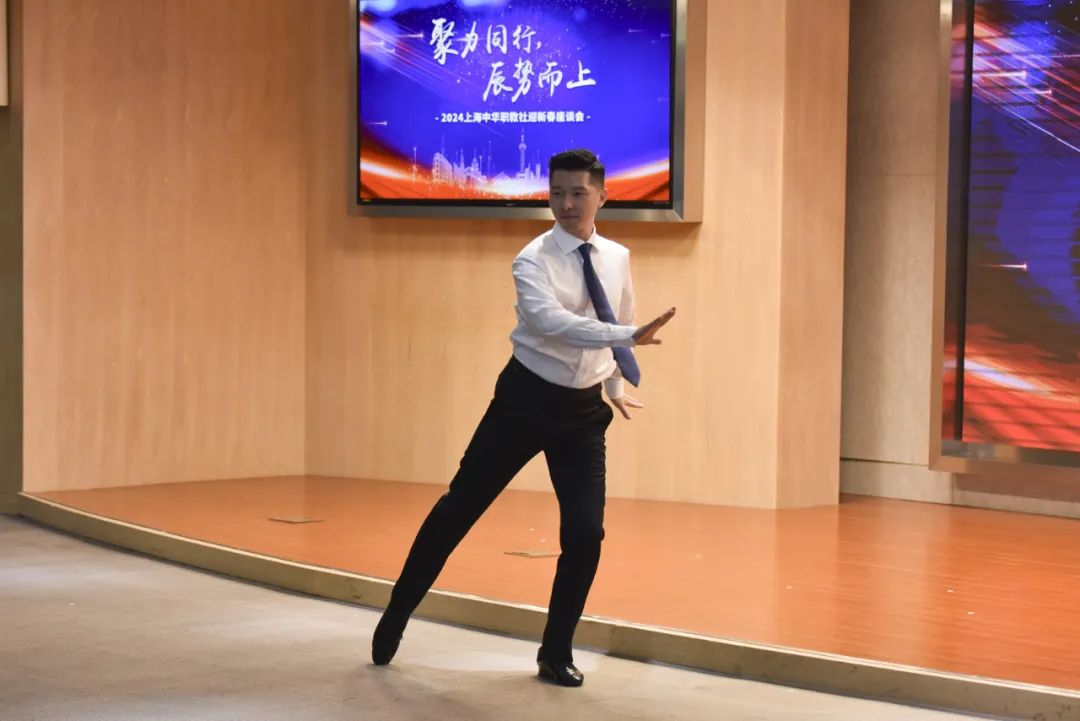 作为本场演出的重头戏之一,由市社常务副主任胡卫与徐汇社社员沈䨝玲联手演绎的《繁花》桥段赢得了满堂喝彩。这部时代大剧反映了上世纪90年代上海改革开放的传奇人生,职教社版的演绎紧密结合工作实际,极具代入感,勾起了大家奋斗干事的共鸣,激发出守正创新的激情与做好职教社事业的热情。随着剧情的层层推进,与会来宾呼应着两位演员,笑声与叫好声不断,更为我们满怀热忱迈向新征程加油鼓劲!