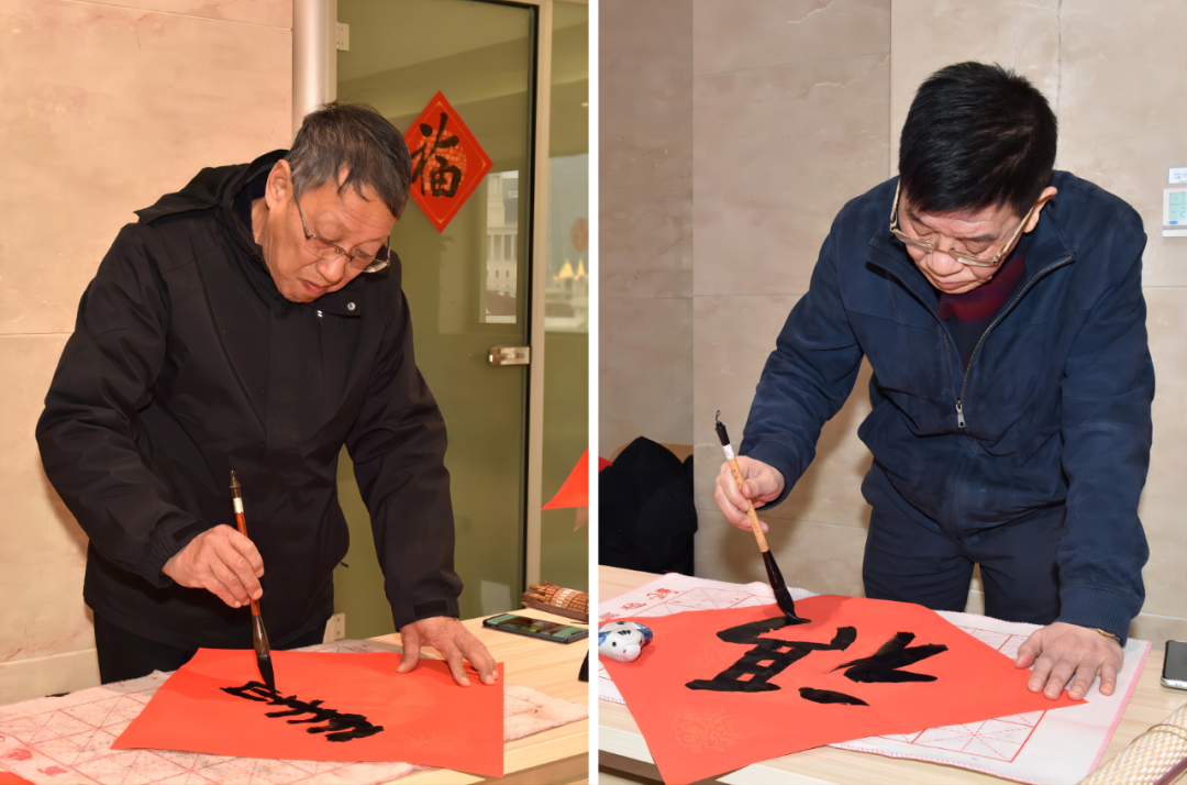 王平、李国华将社员中的书法家书写的福字赠送给与会老同志吴仲信、生杰灵、胡忠泽、李明、李进,祝福老同志们身体健康,福如东海。