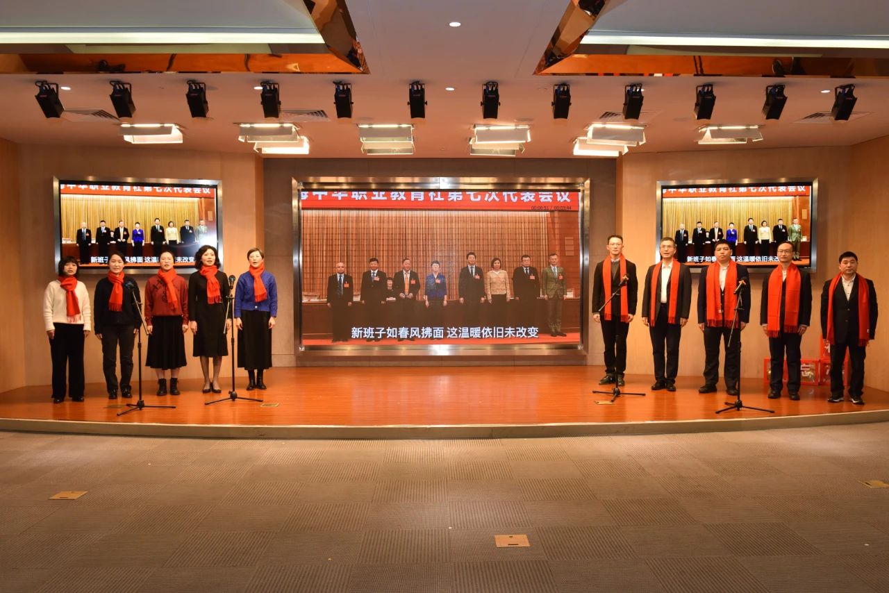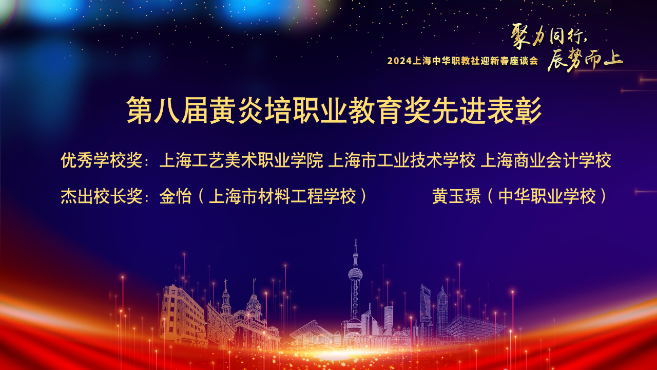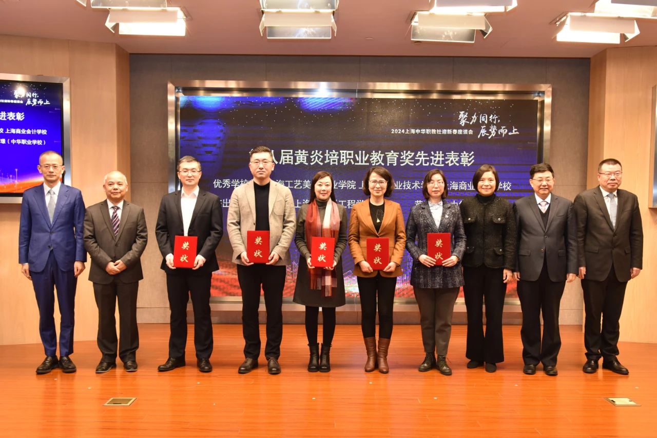 在表彰先进环节,毛丽娟、丁光宏、孙真荣、叶才福、丁祖昱为荣获第八届黄炎培职业教育奖的上海代表们颁发荣誉奖状。该奖作为职业教育领域唯一保留的国家级奖项,代表了我国职业教育界的最高荣誉,体现了上海职业教育高质量发展的累累硕果。