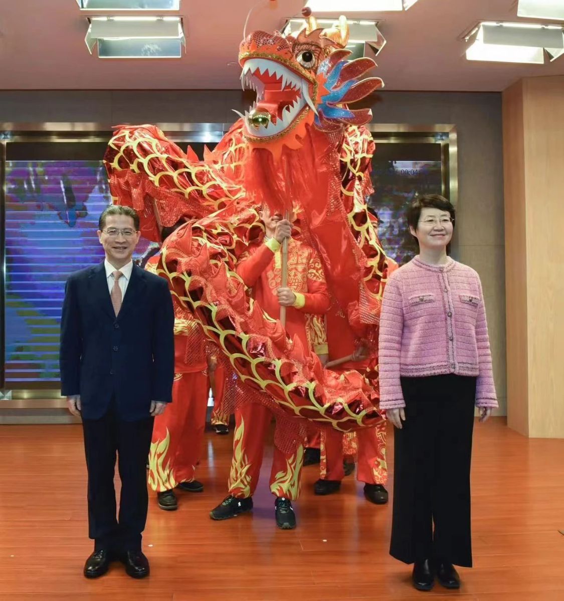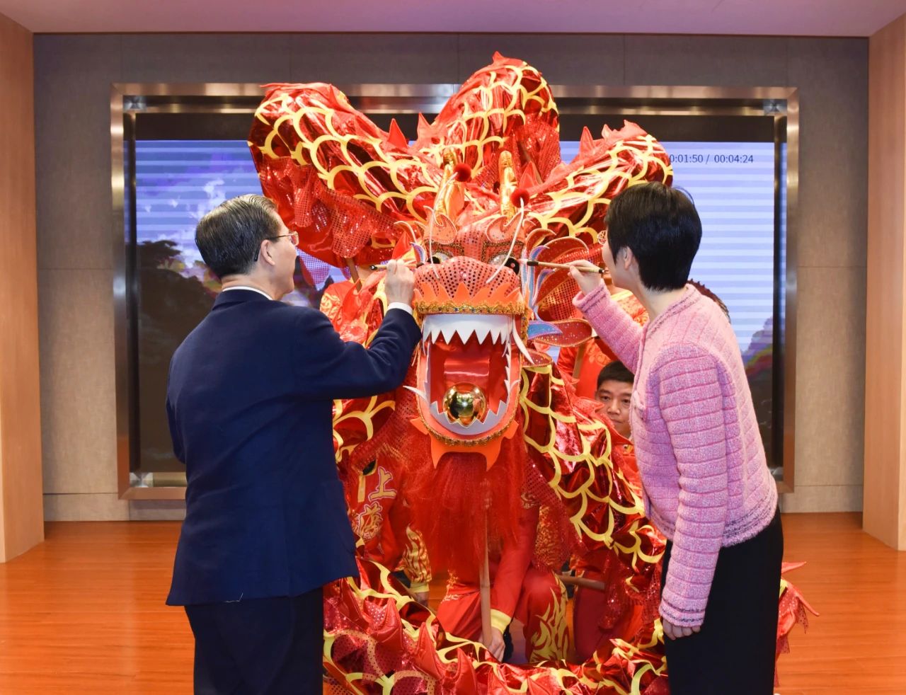 龙是华夏精神的象征,一条由市社机关、一工委同志合力舞动的“中华龙”穿梭于会场中,以摆尾、倒把、盘龙的姿态展现了“戮力同心”“同舟共济”“龙腾四海”的势气。在甲辰龙年到来之际,解冬与周汉民共同提笔为祥龙点睛。在昂扬奋进中国式现代化新征程上,激励广大职教人舞出“精气神”、跑出“加速度”,凝聚“向心力”,画出锦绣中华更大“同心圆”。