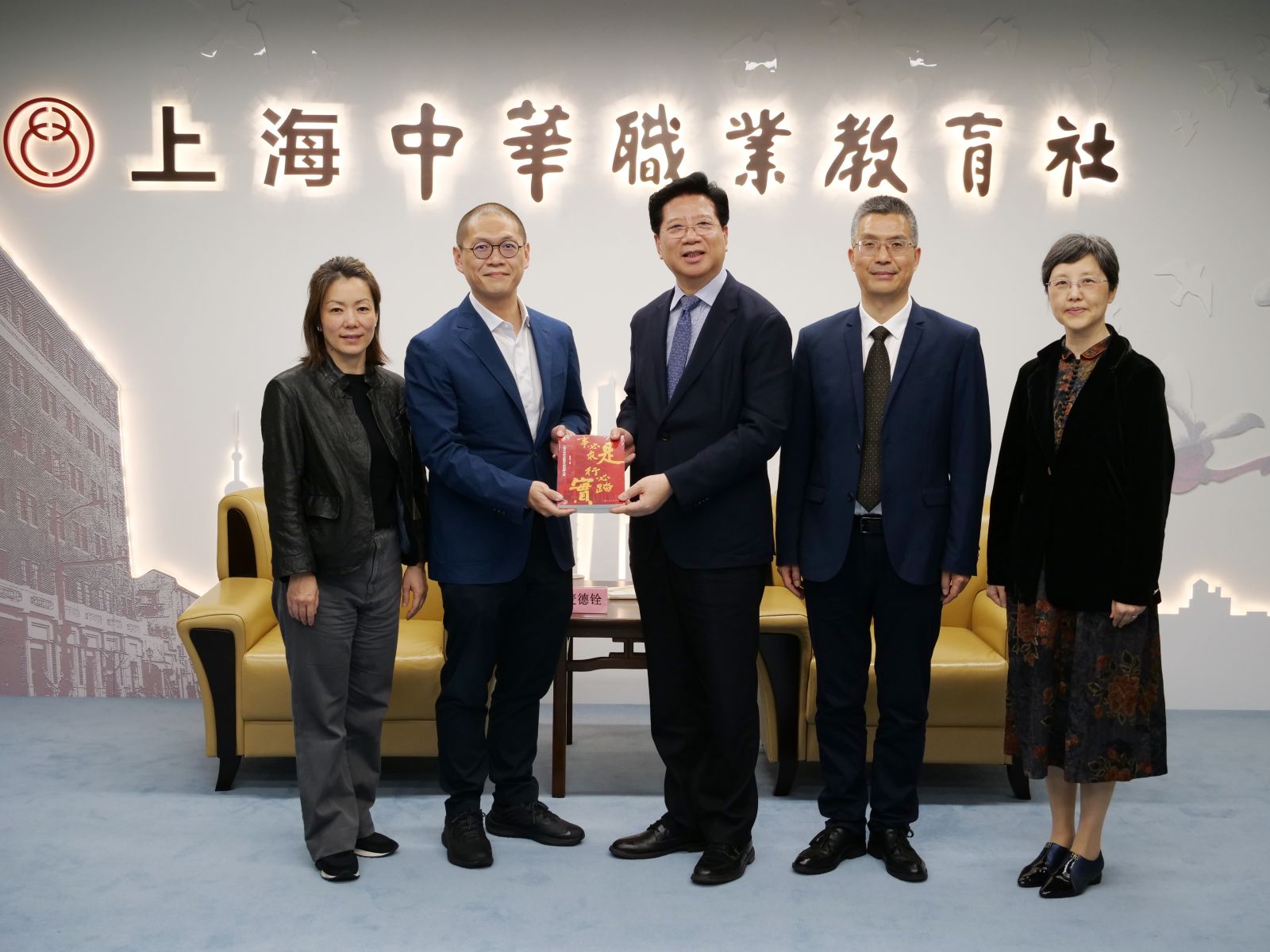 胡卫代表市职教社欢迎麦德铨一行的到来,对沪港社团总会及麦德铨先生多年来致力于促进沪港经贸和青少年交流合作等方面作出的贡献表示钦佩,并向其赠送了《事必求是 行必踏实——上海中华职业教育社的创新九章》《2023年度上海职业教育事业蓝皮书》。
