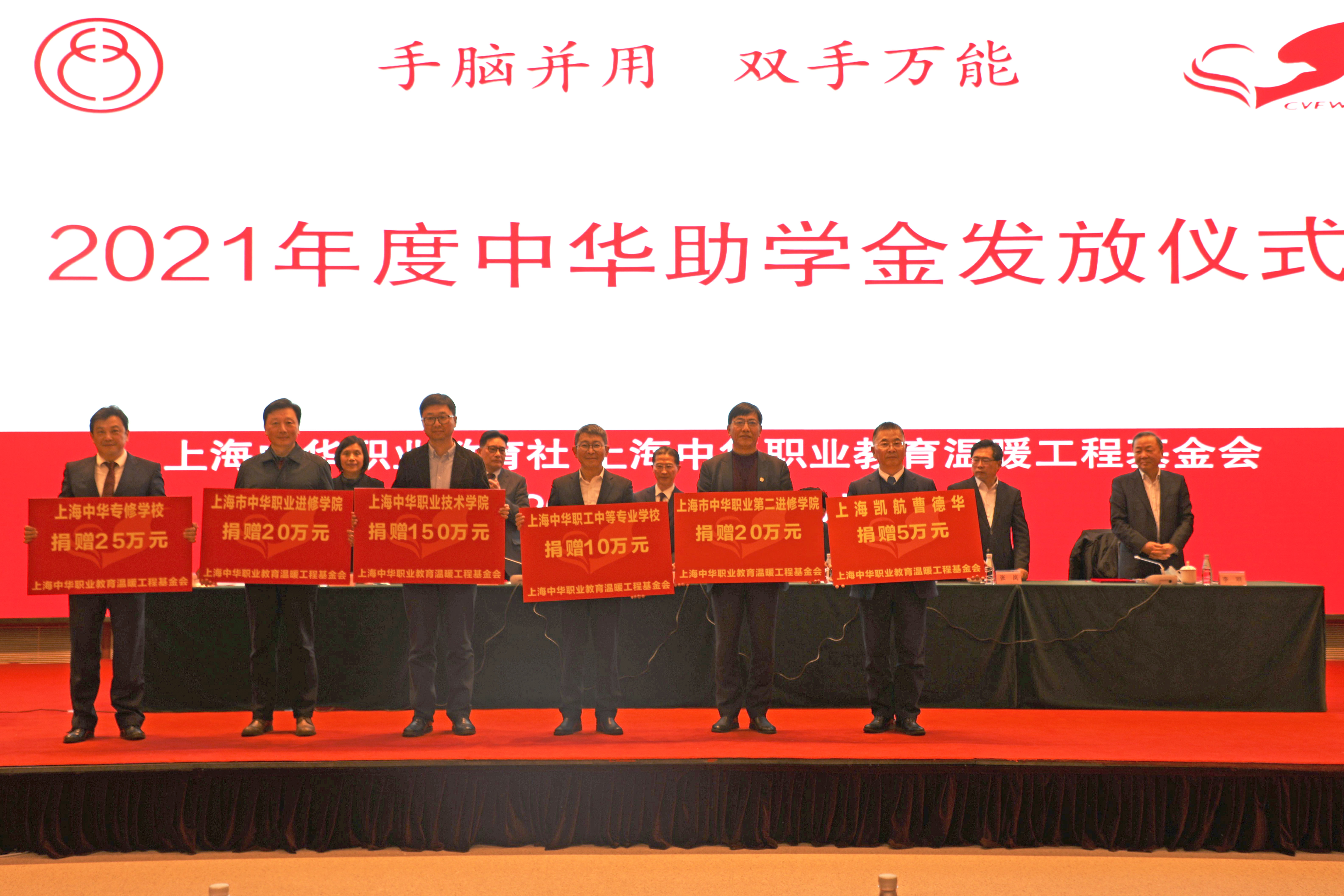 “中华助学金”项目能够聚沙成塔,持续开展公益助学,离不开社会各界的爱心资助和职教社社员的慷慨解囊。现场举行了捐赠仪式,上海中华职业技术学院、上海中华职工中等专业学校、上海市中华职业进修学院、上海市中华职业第二进修学院、上海中华专修学校5所“中华牌”学校及上海凯航通力船用设备有限公司董事长曹德华个人共为温暖工程基金会捐款230万元。