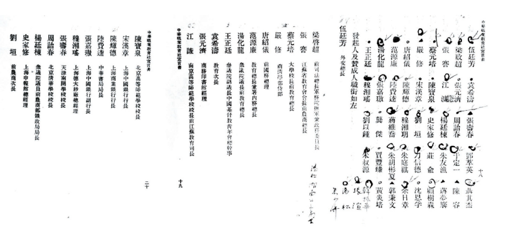 中华职业教育社《宣言书》最初发表时共44人。黄炎培非常谦虚,位列44;沈恩孚同样谦虚,位列43。可见黄炎培谦谨。发起人名单铅字版发布以后,又增加4位,以毛笔书写,为同一人手迹,这样合计为48位发起人。